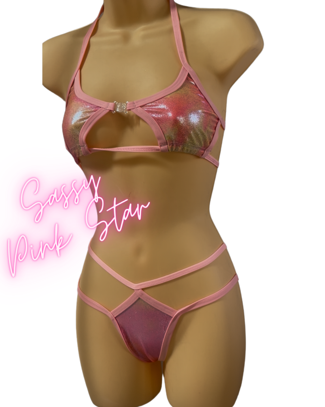 Pastel pink perfection with star power energy. This dreamy set features a star-shaped bikini top and flirty cut thong bottoms that serve soft and spicy. One size, 4-way stretch, made to hug you right in all the right places.